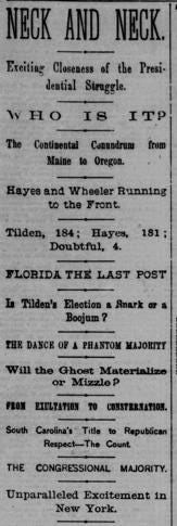 The New York Herald summed up its conclusion thusly: “NECK AND NECK; Exciting Closeness of the Presidential Struggle; WHO IS IT? The Continental Conundrum from Maine to Oregon.”2